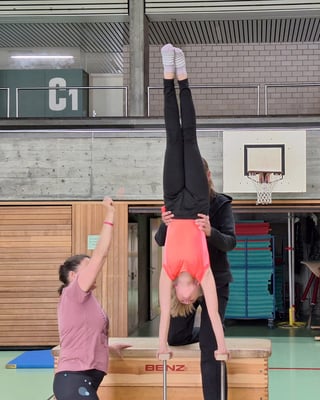 Gemeinsam entwickeln wir akrobatische Elemente und zeigen spektakuläre Choreografien auf einer 12 × 12 m großen Wettkampfmatte vor