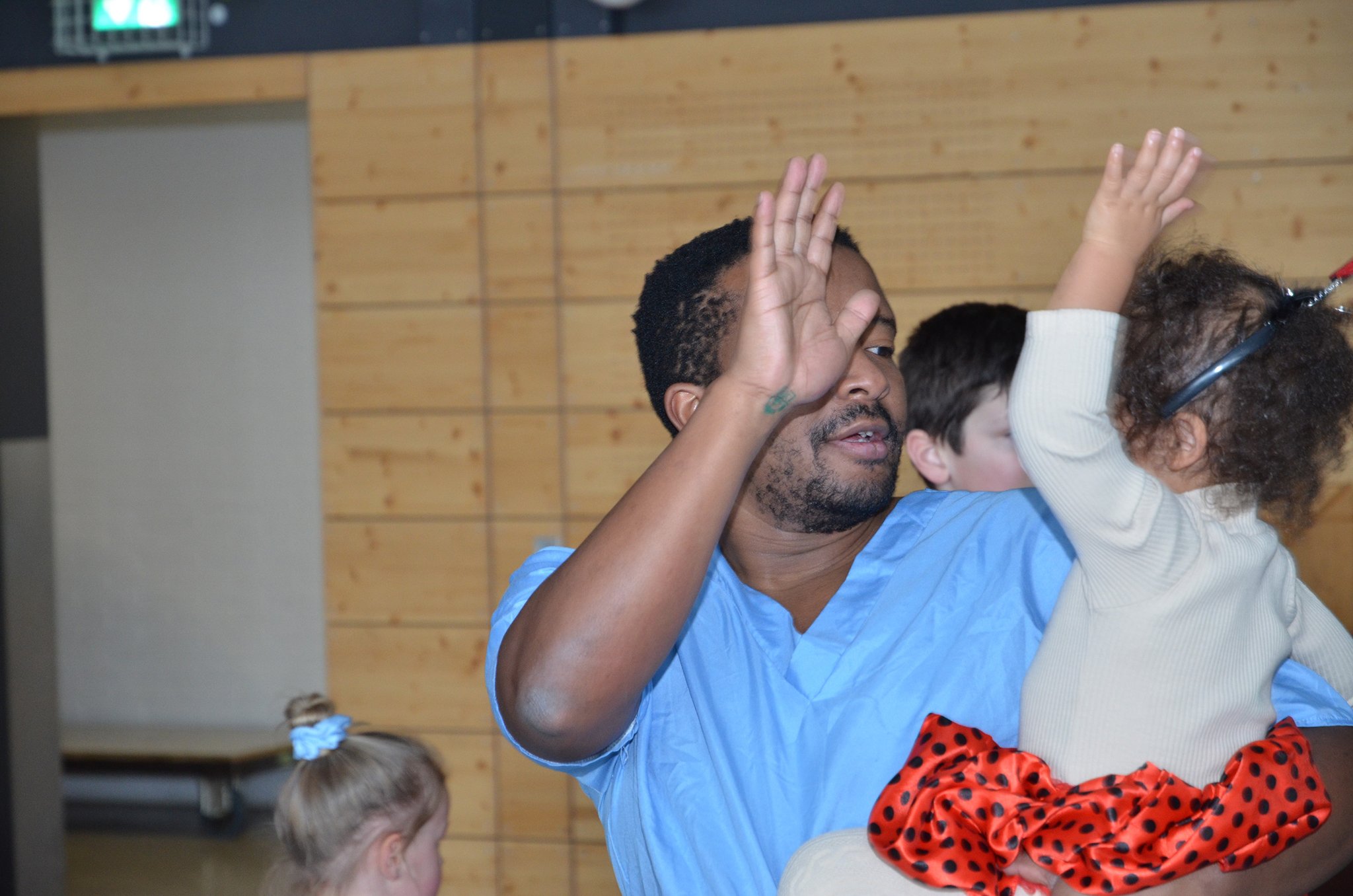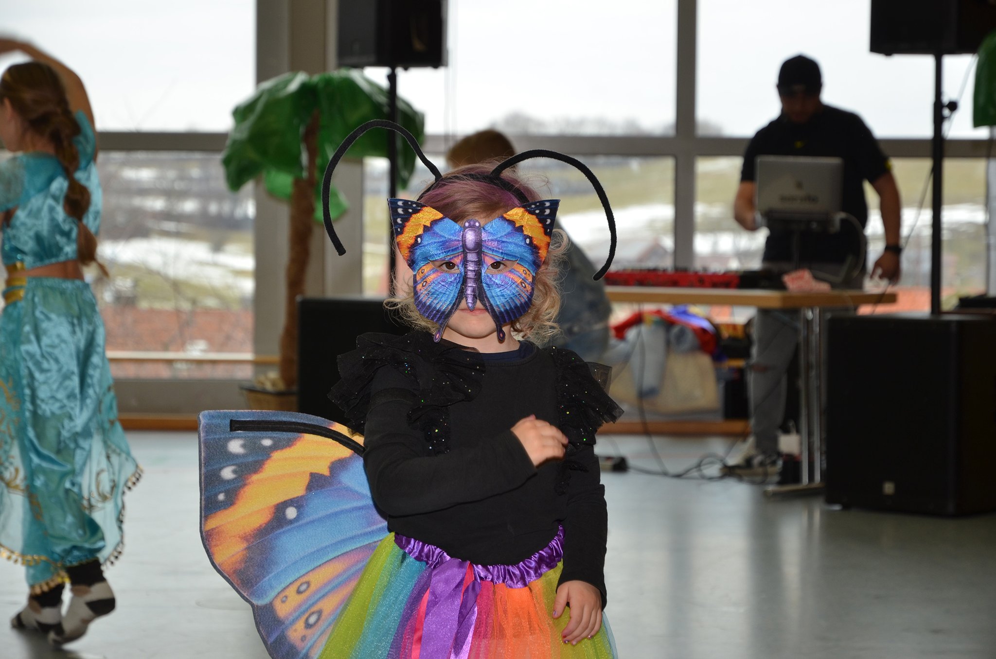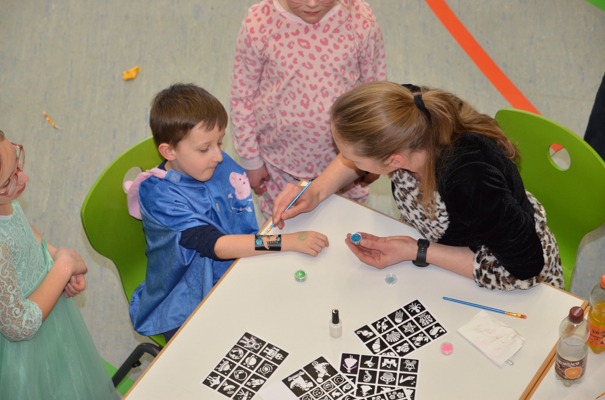 Viele Mädchen und auch einige Jungs scharten sich auch um den großen Tisch, an dem junge Damen den Kindern bunte Glitzertattoos auf Arme und Hände zauberten. Mit allen Kindern, die sich trauten, wurde zum Schluss noch ein großes Gruppenbild gemacht, um die vielen tollen Kostüme auch im Bild zu dokumentieren.